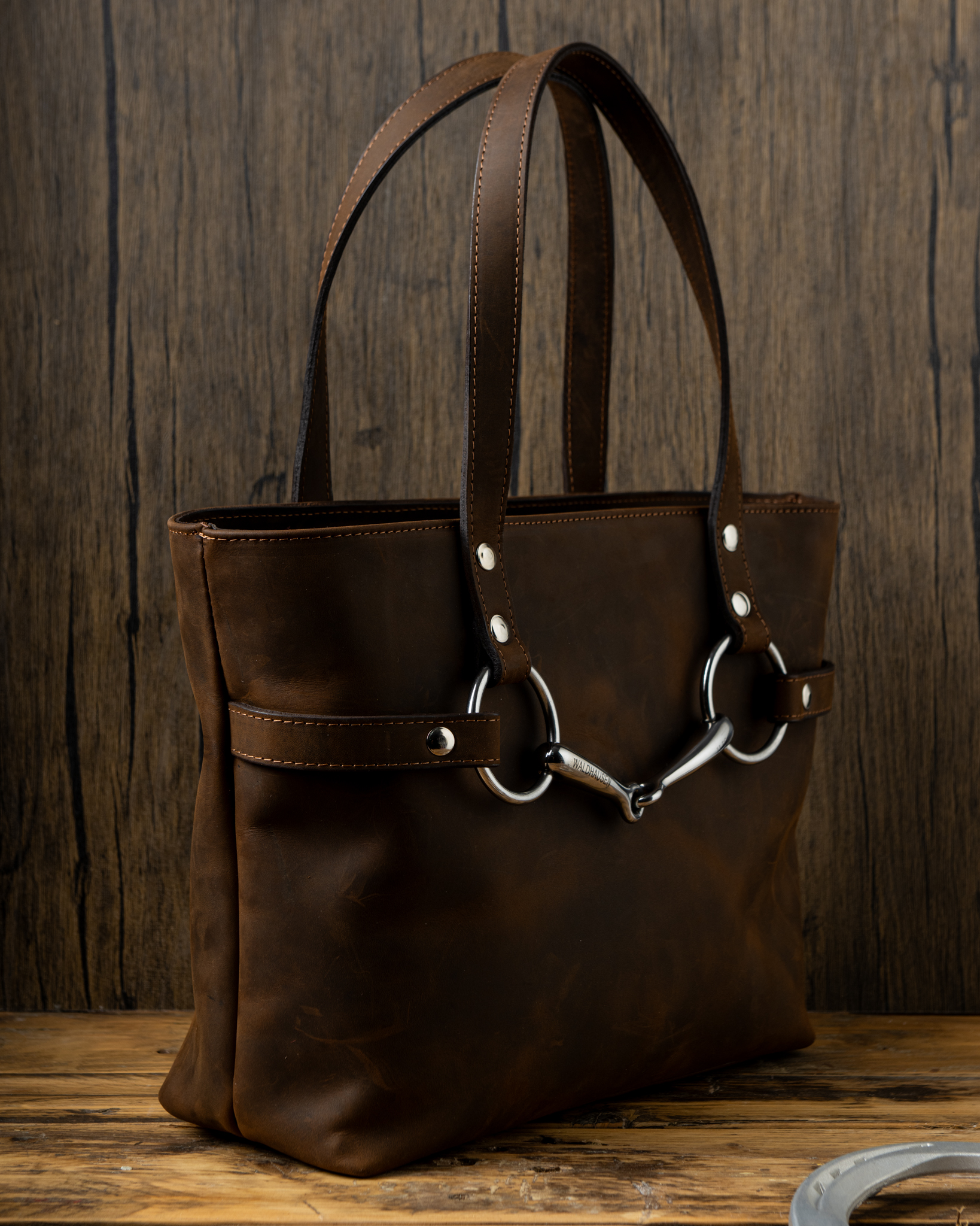 Η μπροστινή όψη διακοσμείται με αυθεντική απλή στομίδα αλόγου WALDHAUSEN, ένα διαχρονικό και κλασικό αξεσουάρ ιππασίας που προσδίδει κομψότητα και χαρακτήρα. Με τον δομημένο σχεδιασμό και το πρακτικό εσωτερικό, η Grand Snaffle συνδυάζει λειτουργικότητα και αυθεντικότητα, ιδανική για καθημερινή χρήση αλλά και ιδιαίτερες περιστάσεις.