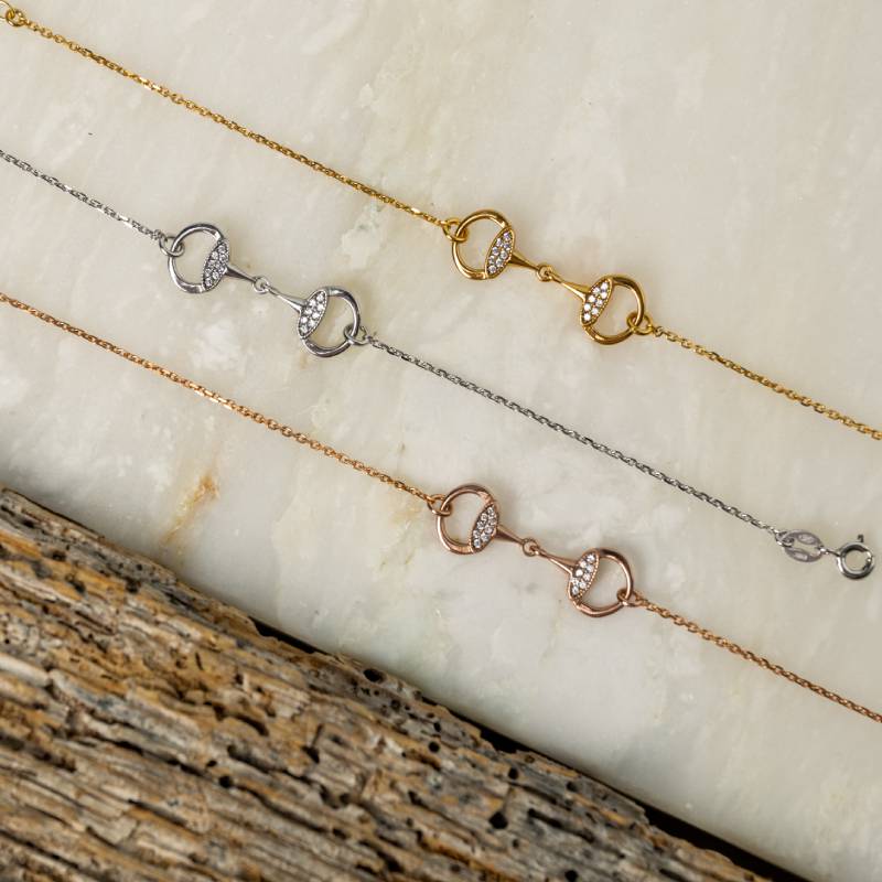 Ένα κομψό και διαχρονικό βραχιόλι που απεικονίζει τη μικρογραφία της κλασικής απλής στομίδας, ενός βασικού στοιχείου του ιππικού εξοπλισμού. Αυτό το κόσμημα συνδυάζει την αρμονία και τη χάρη του ιππικού κόσμου με μια διακριτική αισθητική, αποπνέοντας το κλασικό equestrian look.