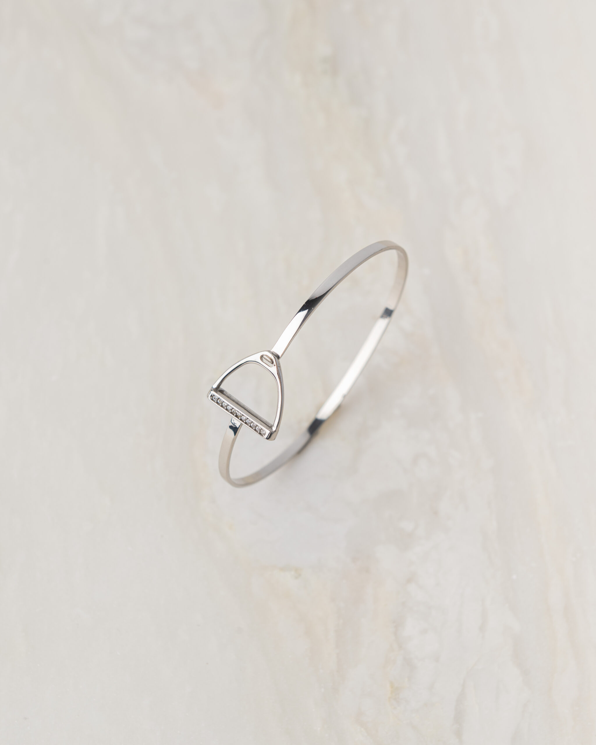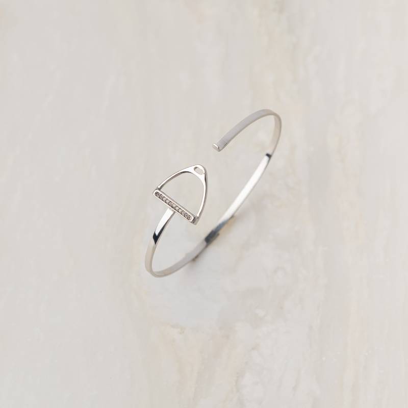 Ένα statement βραχιόλι με εξαιρετική προσοχή στη λεπτομέρεια, εμπνευσμένο από την ιππασία και τον εξοπλισμό της. Σχεδιασμένο για να αποτυπώνει την αρμονία μεταξύ κίνησης και σταθερότητας, το βραχιόλι μικρογραφεί τον αναβολέα με μοναδική ακρίβεια, προσφέροντας μια κομψή και συμβολική πινελιά στο στυλ σας.