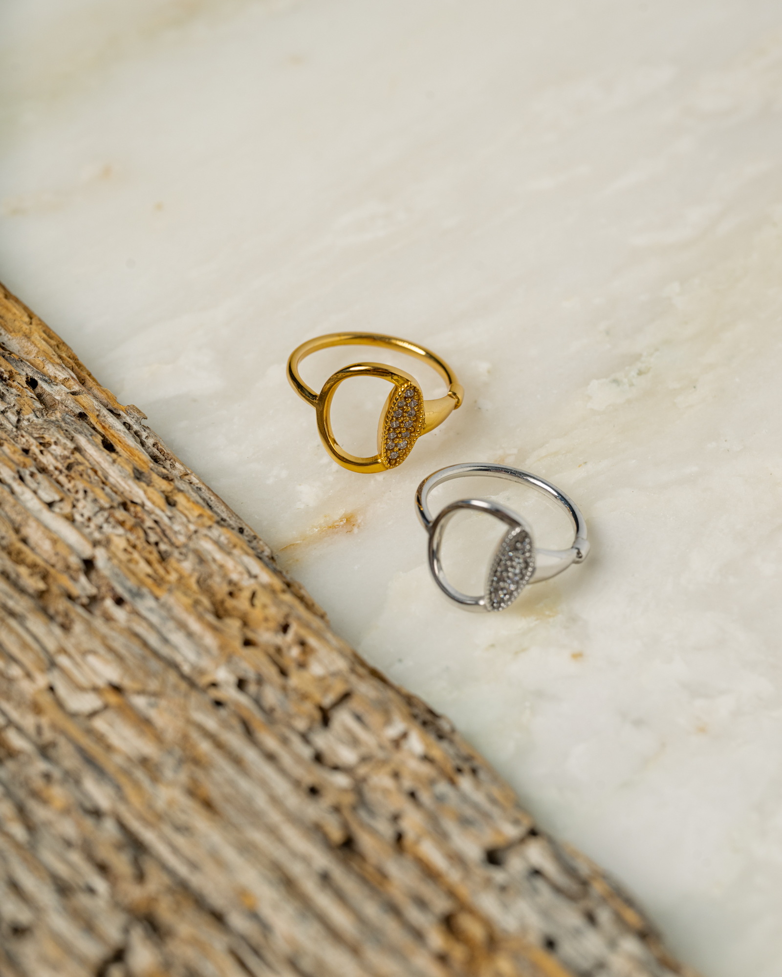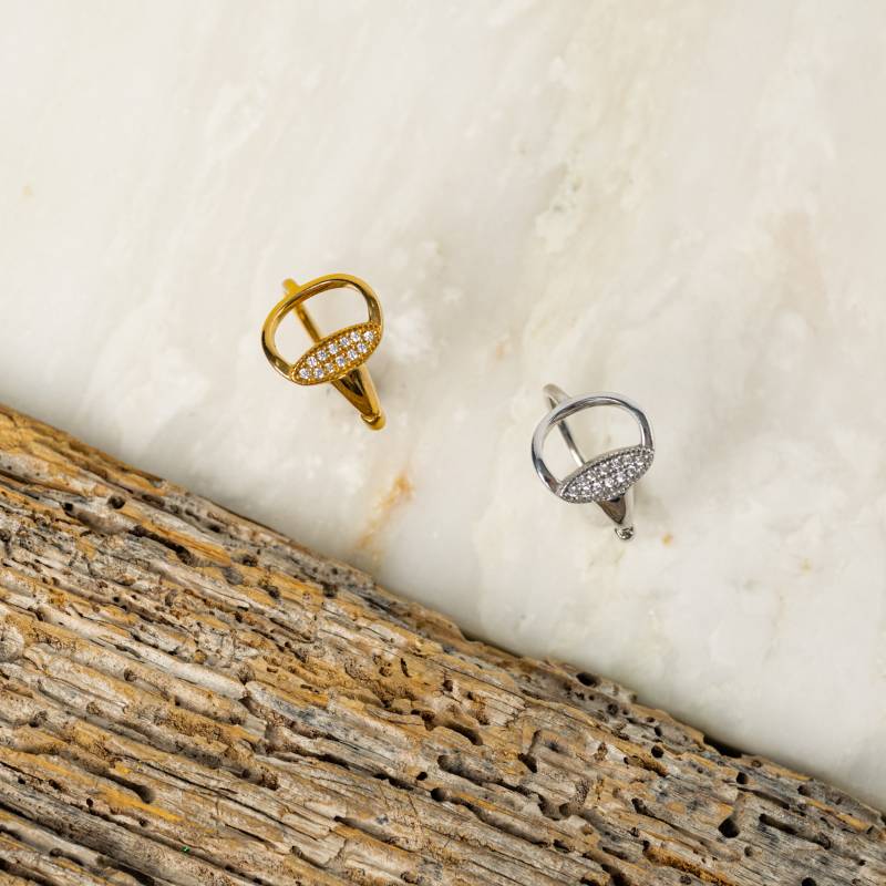 Τα διακριτικά ζιργκόν προσθέτουν μια απαλή, εκλεπτυσμένη λάμψη που φωτίζει το σχέδιο και αναδεικνύει τη φόρμα του, χαρίζοντας στο κόσμημα μια ισορροπία ανάμεσα στο minimal και το εντυπωσιακό.