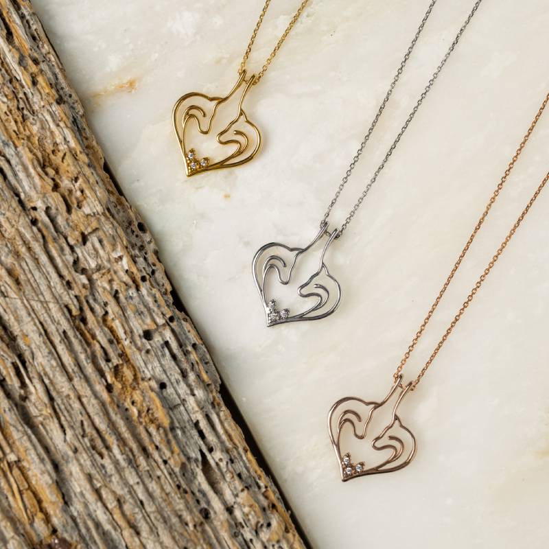 To Ασημένιο κολιέ Bond Keeper σε σχήμα καρδιάς, με δύο αντικριστά κεφάλια αλόγων και τρία διακριτικά ζιργκόν σχεδιάστηκε
