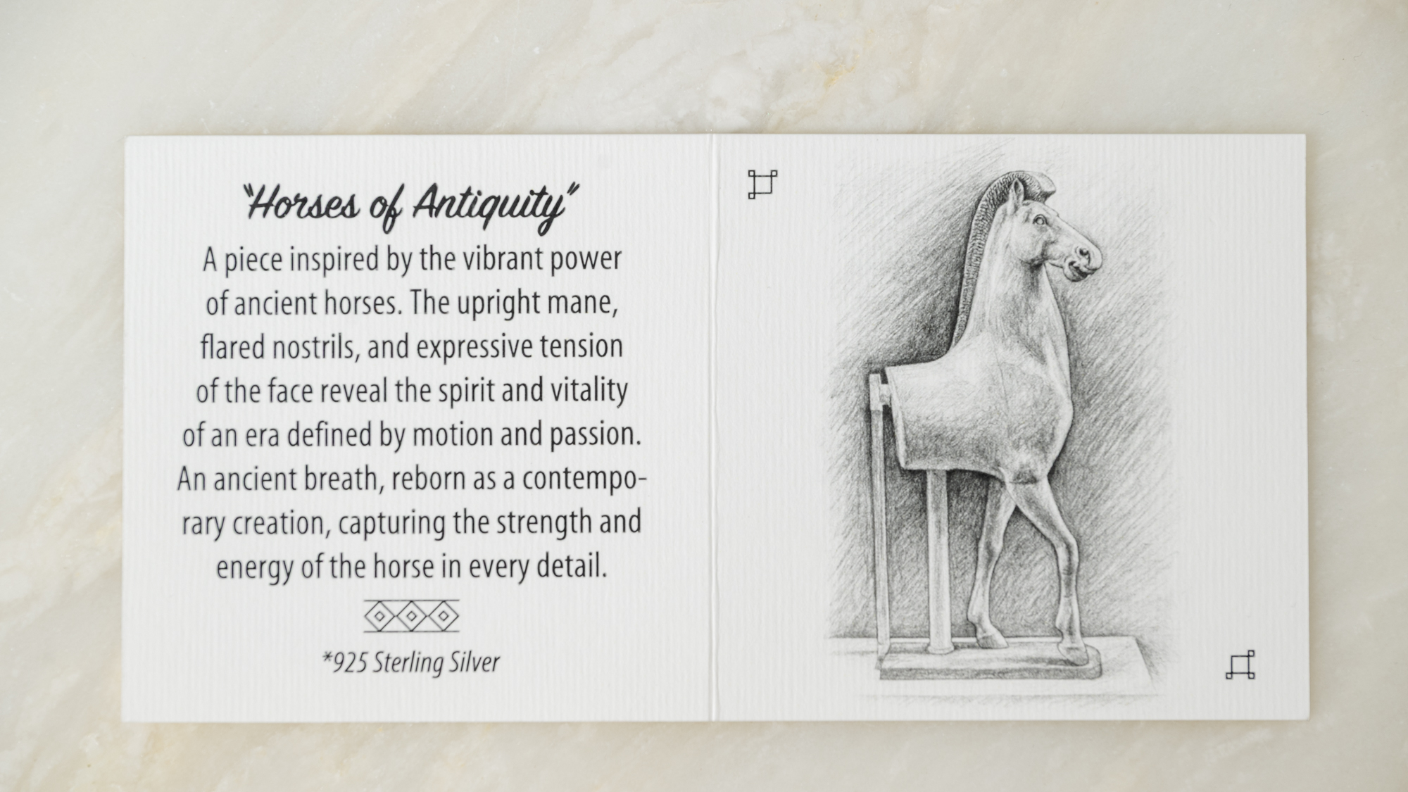 Οι καθαρές γραμμές και η περήφανη στάση αποτυπώνουν τη δύναμη, την ελευθερία και την ευγένεια του αλόγου, όπως αποθανατίστηκε στα αρχαία αγάλματα.