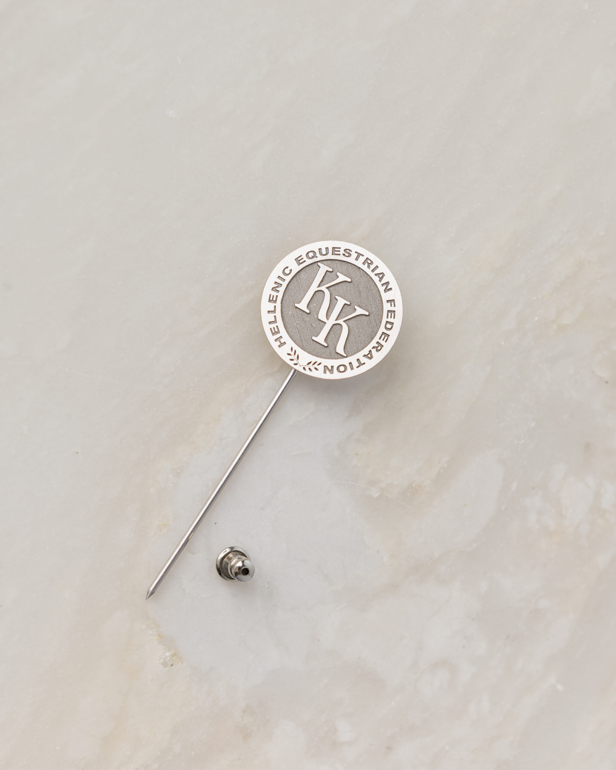 Για τον Πρόεδρο της Ελληνικής Ομοσπονδίας Ιππασίας κατασκευάσαμε μία ιδιαίτερη καρφίτσα από ασήμι, στην οποία αποτυπώνονται με διακριτική κομψότητα τα αρχικά του.
